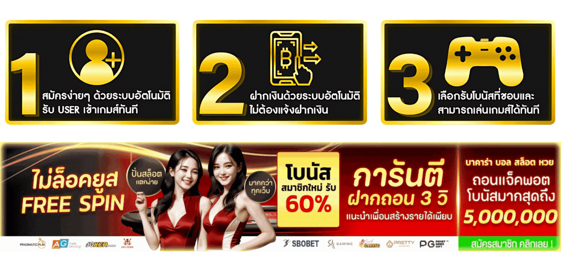ตอบ : - โบนัสต้อนรับสมาชิกใหม่ 100% - คืนยอดเสีย 10% ทุกสัปดาห์ - แนะนำเพื่อนรับค่าคอมมิชชั่น - กิจกรรมแจกเครดิตฟรีประจำเดือน - โบนัสเติมเงินรายวัน 20%